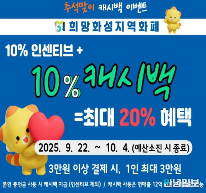 안녕일보 배윤 기자 | 화성특례시가 추석 명절을 맞아 9월 22일부터 10월 4일까지 ‘희망화성지역화폐 특별 캐시백 이벤트’를 운영한다.