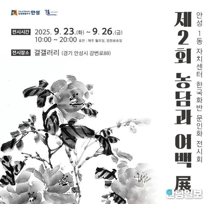 안녕일보 배윤 기자 | 안성1동 자치센터 한국화반은 오는 9월 23일부터 9월 26일까지 안성천 작은미술관 결갤러리에서 ‘제2회 농담과 여백전’을 개최한다.