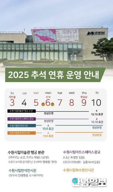 수원시립만석전시관과 수원시립북수원전시관은 추석 당일인 10월 6일(월)만 휴관한다. 김지은, 김참새 작가가 참여해 일상적 도시 환경을 새로운 시선으로 관찰하는 참여형 교육 전시 《모두의 인쌩쌩쌩: 도시와 아이》와대관전시《채운민화연구회》, 《강숙란》, 《윤홍주》, 《이연준》전을 관람할 수 있다.