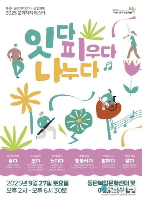 안녕일보 배윤 기자 | 화성시문화관광재단이 오는 9월 27일 14시에 동탄복합문화센터 및 야외공연장 일원에서 시민이 직접 기획하고 실행하는 '2025 문화자치 페스타'를 개최한다.