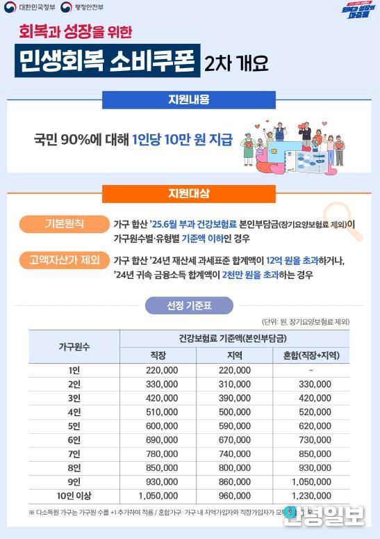 지원 금액은 1인당 10만 원으로 2025년 6월 부과 본인부담 건강보험료 가구별 합산액이 선정기준 이하로, 가구원의 2024년 재산세 과세표준 합계액이 12억 원을 초과하지 않거나 2024년 귀속 금융소득 합계액이 2천만 원을 초과하지 않는 경우다.