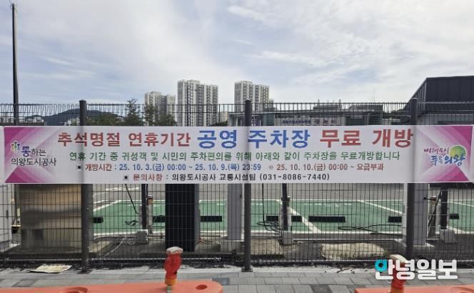 안녕일보 배윤 기자 | 의왕도시공사는 시로부터 위수탁 받아 운영 중인 관내 공영주차장을 추석 명절 연휴 기간인 10월 3일(금) ~ 10월 9일(목)까지 7일간 무료 개방한다고 밝혔다.