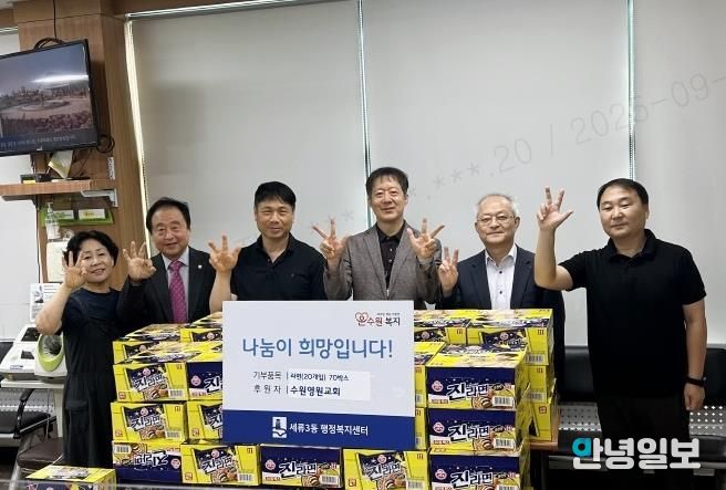 안녕일보 배윤 기자 | 수원영원교회는 지난 22일, 추석 명절을 맞이하여 관내 취약계층을 위해 세류3동 행정복지센터에 라면(20개입) 70박스를 후원하며 이웃사랑 나눔을 실천했다.