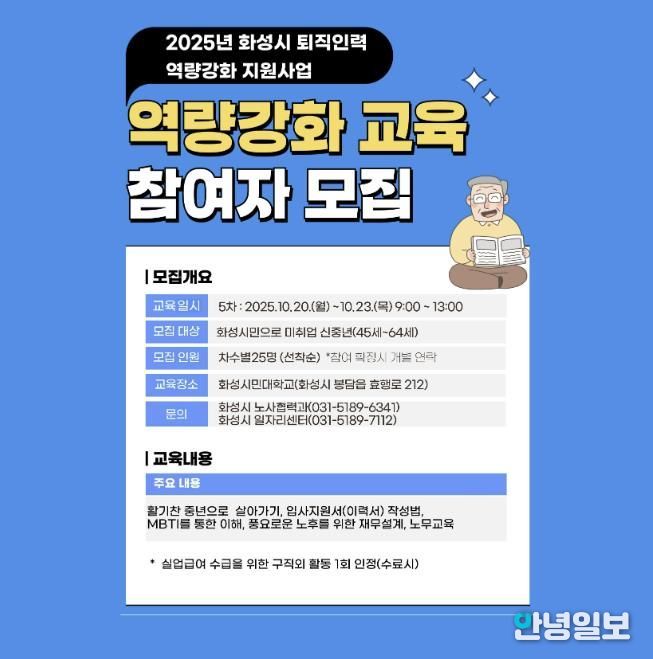 안녕일보 배윤 기자 | 화성특례시가 퇴직 인력의 사회 재진출과 노후 준비를 돕기 위한 ‘역량강화 교육’ 5기 참여자를 모집한다고 24일 밝혔다.
