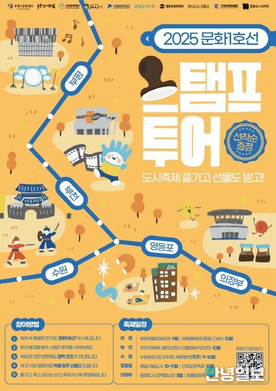 안녕일보 배윤 기자 | 수원문화재단은 수도권 1호선 라인을 따라 펼쳐지는 특별한 문화여행,‘문화 1호선 스탬프 투어’를 오는 9월부터 11월까지 부평, 부천, 영등포, 수원, 의정부 5개 법정문화도시 축제 현장에서 운영한다고 밝혔다.