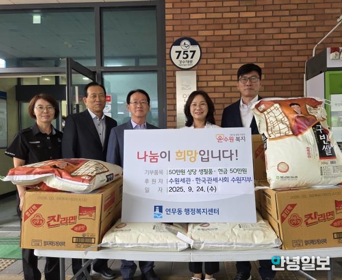 안녕일보 배윤 기자 | 수원시 장안구 연무동은 지난 24일, 추석을 맞아 수원세관과 한국관세사회 수원지부로부터 50만원 상당의 생필품 꾸러미와 50만원의 성금을 전달받았다.