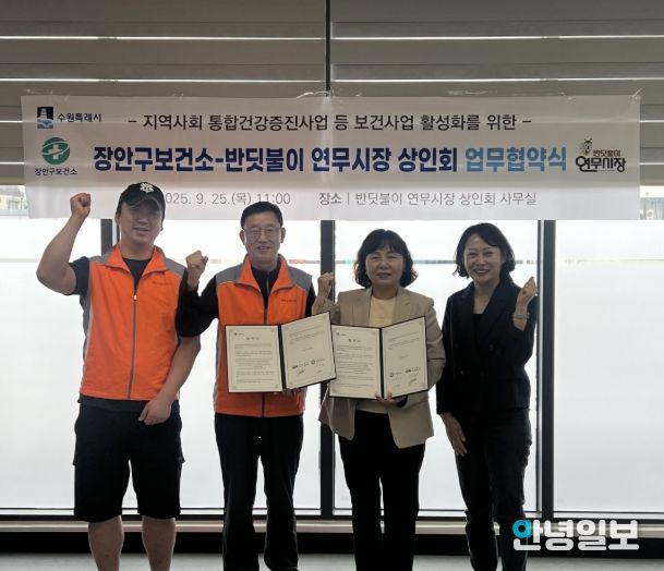 안녕일보 배윤 기자 | 수원시 장안구보건소는 25일 반딧불이 연무시장 상인회와 ‘지역사회 통합건강증진사업 등 보건사업 활성화’를 위한 업무협약을 체결했다.