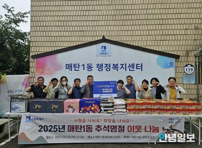 안녕일보 배윤 기자 | 25일 수원특례시 영통구 매탄1동은 추석 명절을 맞이하여 관내 저소득층 300여 세대에 후원물품을 전달하는 이웃돕기 나눔 전달식을 개최했다.