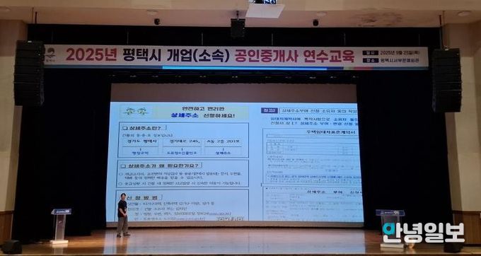 안녕일보 배윤 기자 | 평택시 토지정보과는 지난 25일 서부문화예술회관에서 실시한 ‘2025년 공인중개사 연수교육’ 현장에서 ‘상세주소제도’ 등 도로명주소 관련 홍보를 했다.