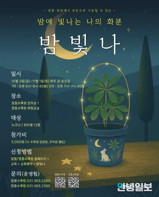 안녕일보 배윤 기자 | 수원특례시는 일월·영흥 수목원에서 10월 3일부터 11월 1일까지 매주 금·토요일 야간에 열리는 행사 ‘밤빛정원’에서 다양한 체험 프로그램들을 운영한다.