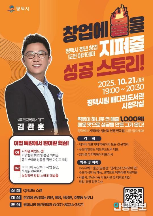 안녕일보 배윤 기자 | 평택시는 청년들의 창업을 지원하기 위해 오는 10월 21일 오후 7시, 평택시립 배다리도서관 시청각실에서 ㈜두끼 떡볶이 김관훈 대표이사를 초청해 특강을 연다.