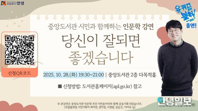 안녕일보 배윤 기자 | 안성시는 오는 10월 28일 저녁 7시 30분, 중앙도서관 다목적홀에서 정미소출판사 대표이자 『당신이 잘되면 좋겠습니다』의 저자 김민섭 작가를 초청해 시민 강연회를 개최한다.