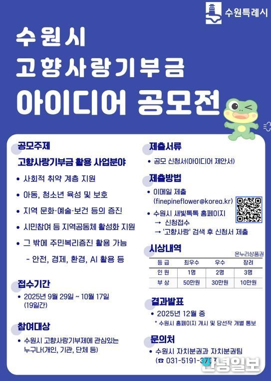 수원시 관계자는 “이번 공모전은 전 국민이 참여해 수원의 미래를 함께 만들어가는 참여형 프로젝트”라며 “기부자와 시민의 아이디어가 정책으로 실현되도록 노력해 고향사랑 기부제가 지역 발전의 실질적 성과로 이어지게 하겠다”고 말했다.