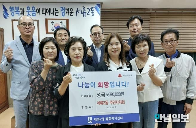 안녕일보 배윤 기자 | 수원시 권선구 세류2동 주민자치회는 지난 10월 1일, 추석 명절을 맞이하여 이웃돕기 성금 507만원을 세류2동 행정복지센터에 기부했다.
