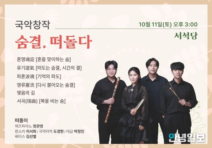 안녕일보 배윤 기자 | 광주문화재단(대표이사 노희용) 전통문화관은 오는 10월 11일 오후 3시, 토요 상설공연 22회차로 퓨전국악 단체 떠돌이의 '숨결, 떠돌다' 무대를 선보인다.