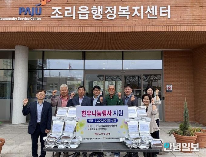 안녕일보 배윤 기자 | 파주시 조리읍은 지난 9월 30일 전국한우협회 파주시지부로부터 추석 명절을 맞아 220만 원 상당의 한우 양지 43kg을 기탁 받았다고 전했다.