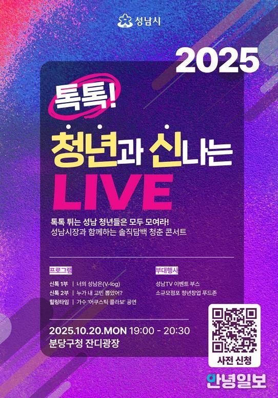 안녕일보 배윤 기자 | 성남시는 청년 세대와의 소통을 강화하고 청년의 목소리를 시정에 반영하기 위해 '톡톡! 청년과 신나는 LIVE'를 오는 10월 20일 오후 7시부터 8시 30분까지 분당구청 앞 잔디광장에서 개최한다.