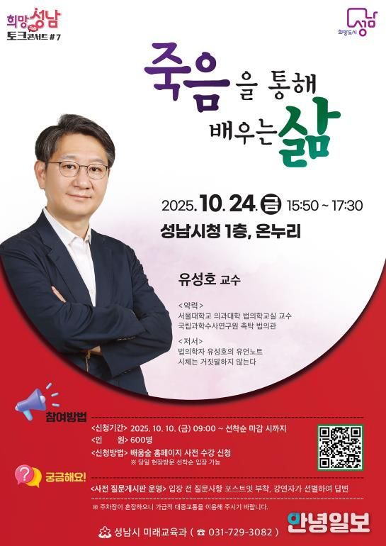 안녕일보 배윤 기자 | 성남시는 법의학자인 유성호 서울대 교수를 초빙해 오는 10월 24일 오후 3시 50분 시청 1층 온누리에서 ‘희망성남 토크콘서트 7강’을 연다.