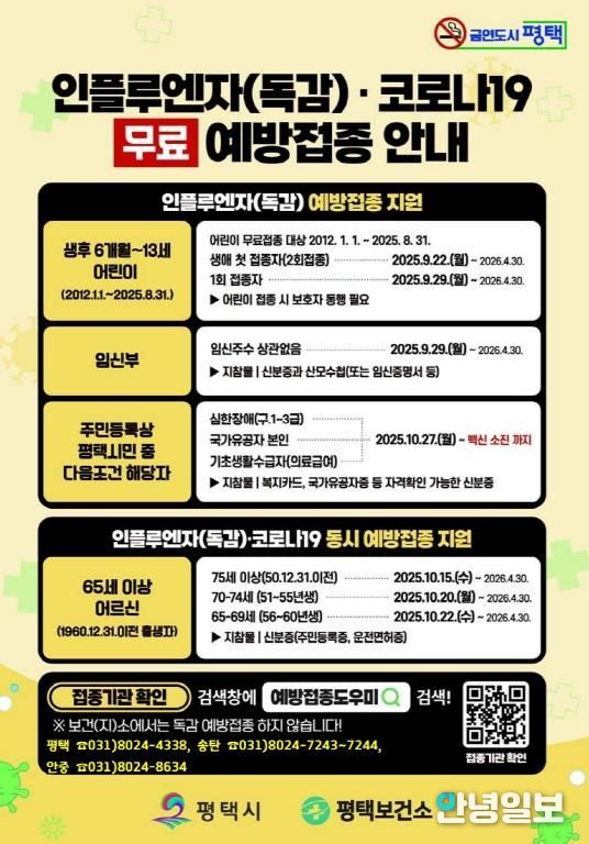 코로나19 및 인플루엔자(독감) 무료 예방접종은 별도의 예약 없이 신분증을 지참하고 지정된 위탁의료기관에서 받을 수 있으며, 예방접종도우미 누리집 및 평택보건소 누리집에서 위탁의료기관을 확인할 수 있다.