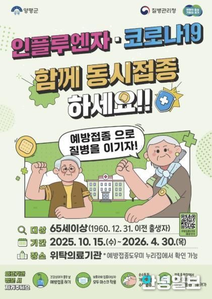 안녕일보 배윤 기자 | 양평군은 오는 15일부터 관내 지정 의료기관에서 65세 이상 어르신을 대상으로 독감(인플루엔자)·코로나19 무료 예방접종을 동시에 실시한다고 밝혔다.