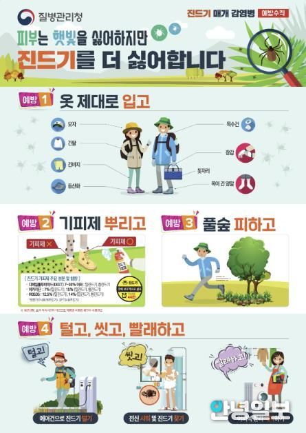 진드기 매개 감염병 예방을 위해서는 ▲야외 활동 시 진드기 기피제 사용 및 긴소매·긴바지·모자 등 착용으로 피부 노출 최소화 ▲야외활동 후 즉시 샤워 및 옷 갈아입기 ▲얼굴, 귀, 몸통 등에 진드기 부착 여부 확인 등의 수칙을 지켜야 한다.