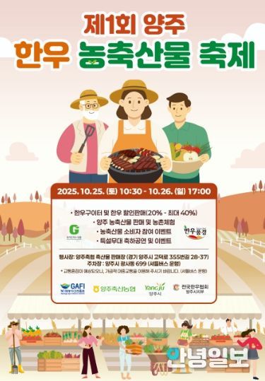 안녕일보 배윤 기자 | 양주시가 양주축산농협과 공동으로 주최하고, 경기도농수산진흥원 공모사업 지원으로 추진되는 '제1회 양주 한우 농축산물 축제'를 오는 10월 25일부터 26일까지 이틀간 개최한다.
