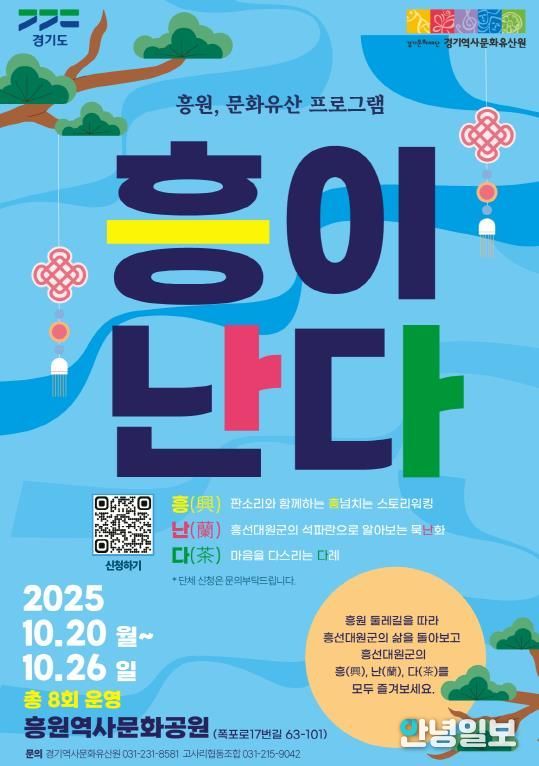 안녕일보 배윤 기자 | 경기도와 경기문화재단(경기역사문화유산원)은 오는 10월 20일부터 26일까지 흥선대원군의 묘소인 흥원(남양주시 화도읍 폭포로17번길 63-101)에서 문화유산 프로그램 ‘흥이난다’를 개최한다.