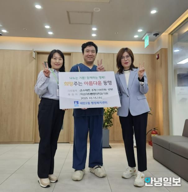 안녕일보 배윤 기자 | 지난 15일, 수원시 영통구 소재 미소마취통증의학과의원은 관내 저소득 어르신들이 따뜻한 겨울을 보낼 수 있도록 매탄2동 행정복지센터에 100만원 상당의 온수매트 8세트를 기부했다.