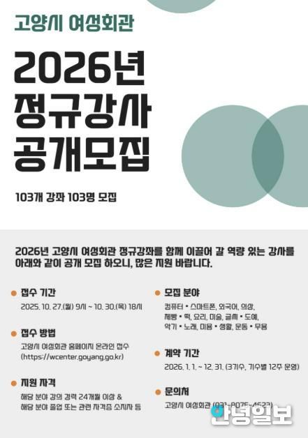 안녕일보 배윤 기자 | 고양특례시 여성회관에서 2026년 정규강좌 운영을 위한 정규강사진을 공개 모집한다.
