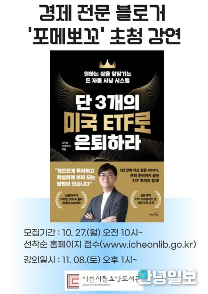 안녕일보 배윤 기자 | 이천시 효양도서관은 시민들의 경제적 이해력 향상과 현명한 자산 관리 능력 제고를 위해 오는 11월 8일 오후 1시, '단 3개의 미국 ETF로 은퇴하라'의 저자이자 네이버 경제 전문 블로거 김지훈(필명 포메뽀꼬)을 초청해 재테크 특강을 진행한다.
