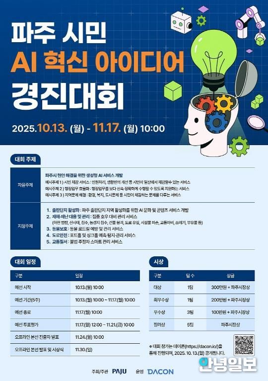 안녕일보 배윤 기자 | 파주시는 10월 13일부터 11월 17일까지 시민이 직접 참여하는 ‘파주 시민 인공지능(AI) 혁신 아이디어 경진대회’를 개최한다고 밝혔다.