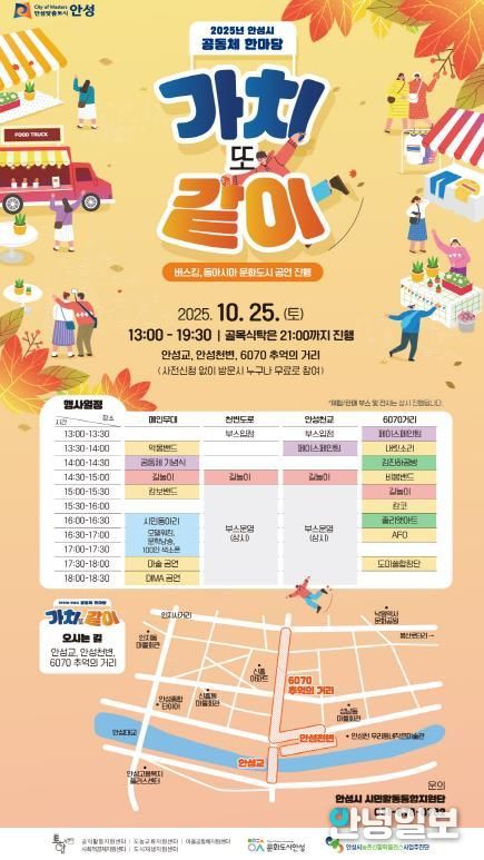 안녕일보 배윤 기자 | 안성시는 오는 2025년 10월 25일, 안성시내 일원(안성교~안성천변~안성천~6070 추억의거리)에서 2025 안성시 공동체 한마당 ‘가치 또 같이’ 를 개최한다.
