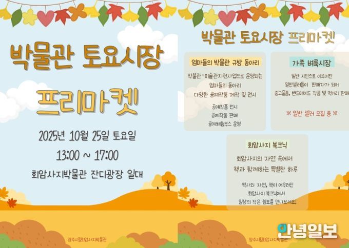 안녕일보 배윤 기자 | 양주시립회암사지박물관이 오는 25일 오후 1시부터 5시까지 가을을 맞아 “박물관 토요시장” 프리마켓을 운영한다.
