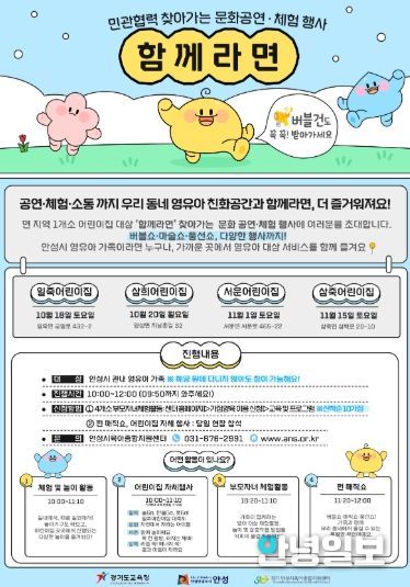 안녕일보 배윤 기자 | 안성시육아종합지원센터는 오는 10월 18일부터 11월 15일까지 면지역 어린이집을 거점으로 영유아 가족을 대상으로 한 찾아가는 육아지원 프로그램 ‘함께라면(面)’을 운영한다고 밝혔다.