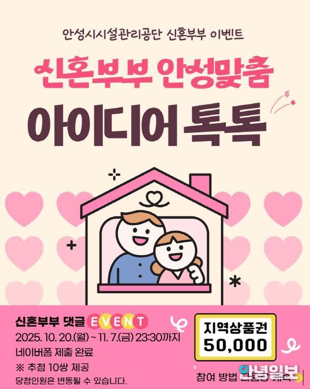 안녕일보 배윤 기자 | 안성시시설관리공단은 안성시에 거주하는 신혼부부의 의견을 직접 듣고, 공단 시설과 서비스를 생활 속에서 체감할 수 있도록 발전시키기 위해 ‘신혼부부의 안성맞춤 아이디어 톡톡’ 공모전을 개최한다.