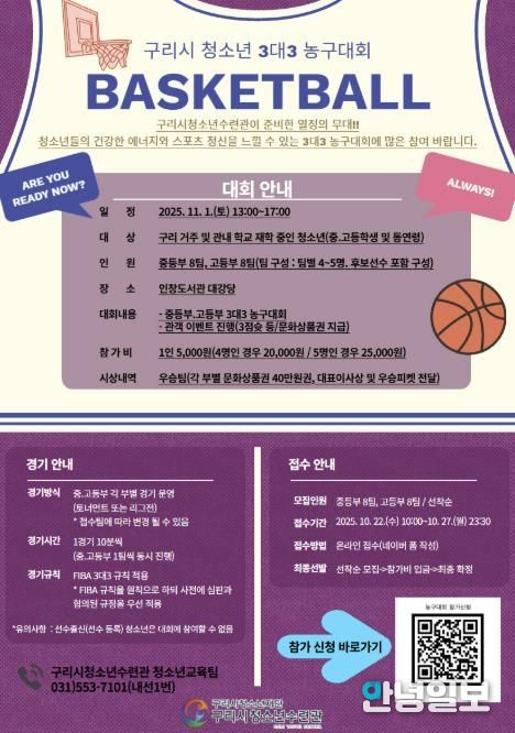 안녕일보 배윤 기자 | 구리시청소년재단 청소년수련관은 '2025 구리시 청소년 3대3 농구대회' 참가 신청을 10월 22일부터 10월 27일까지 온라인으로 신청받는다고 밝혔다.