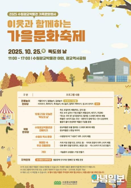 안녕일보 배윤 기자 | 수원광교박물관은 독도의 날인 10월 25일 오전 11시부터 오후 5시까지 수원광교박물관 야외(광교역사공원)에서 ‘2025 수원광교박물관 가족문화행사–이웃과 함께하는 가을문화축제’를 연다.