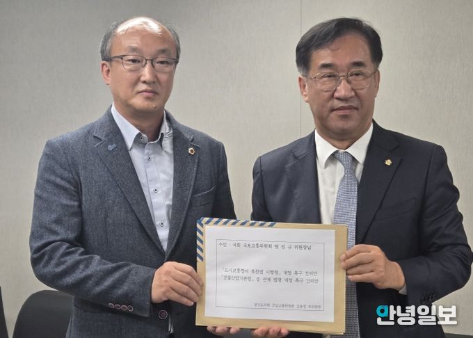 안녕일보 배윤 기자 | 경기도의회 건설교통위원회 김동영 부위원장(더불어민주당, 남양주 오남)은 20일 경기도청 율곡홀에서 열린 2025년 국회 국토교통위원회 국정감사 현장을 찾아, 국회 국토교통위원회 맹성규 위원장에게 '도시교통정비 촉진법 시행령' 개정 촉구 건의안과 '건설산업기본법' 개정 촉구 건의안 등 경기도의회가 의결한 두 건의 건의안을 전달했다.