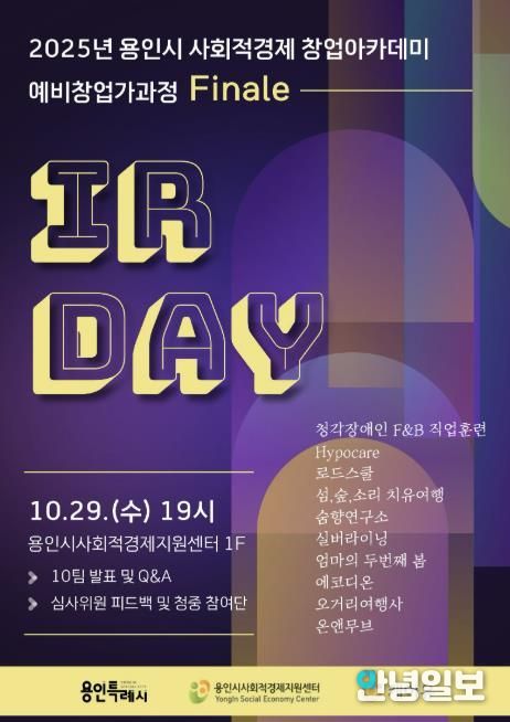 안녕일보 배윤 기자 | 용인특례시는 오는 29일 열리는 ‘사회적경제 창업아카데미 파이널 IR 데모데이’에 참가할 ‘청중평가단’을 모집한다고 22일 밝혔다.