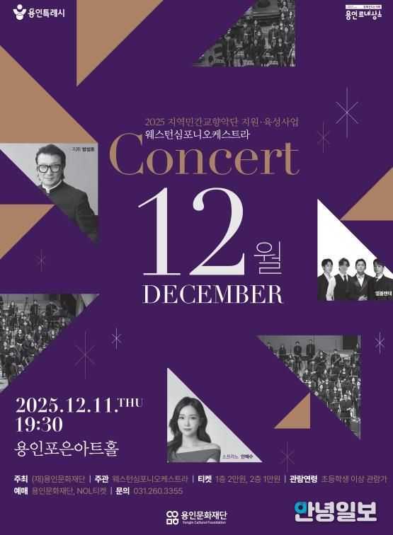 안녕일보 배윤 기자 | 용인문화재단은 오는 12월 11일 오후 7시 30분, 용인포은아트홀에서 웨스턴심포니오케스트라 '콘서트 ‘12월’' 공연을 개최한다.