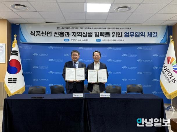 안녕일보 배윤 기자 | 군포산업진흥원은 10월 16일 한국식품산업클러스터진흥원과 군포시 식품산업 발전과 식품 제조·가공 기업 육성과 경쟁력 강화를 위한 업무협약(MOU)을 체결했다고 밝혔다.