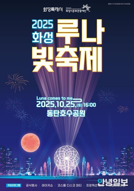 안녕일보 배윤 기자 | (재)화성시문화관광재단은 화성시 대표 명소인 동탄호수공원과 루나쇼를 연계한 '2025 화성 루나 빛 축제'를 오는 10월 25일 토요일 16시에 개최한다.