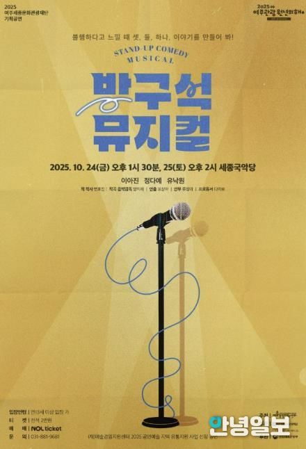 안녕일보 배윤 기자 | 여주세종문화관광재단이 오는 10월 24일~25, 양일간 예술경영지원센터의 공모사업인 '공연예술 지역 유통지원 사업'의 일환으로 뮤지컬‘방구석 뮤지컬’을 세종국악당에서 개최한다.