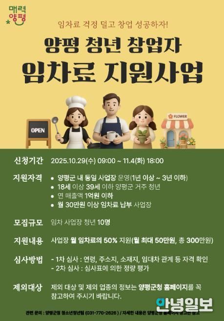 지원 대상은 △양평군에 주소를 둔 18세 이상 39세 이하 △공고일 기준 사업자등록증명 상 개업일 1년 이상 3년 이하 △연 매출액 1억 원 이하 △월 임차료 30만 원 이상 납부 중인 청년 창업자이다.