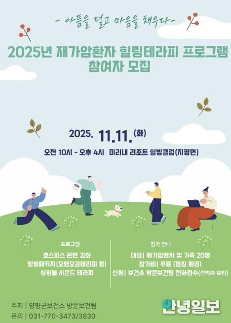 안녕일보 배윤 기자 | 양평군은 재가암환자와 그 가족을 대상으로 ‘2025년 재가암환자 힐링테라피 프로그램’ 대상자를 모집한다고 밝혔다. 프로그램은 오는 11월 11일, 양평 미리내 리조트 내 힐빙클럽에서 진행될 예정이며, 총 20명을 모집한다.