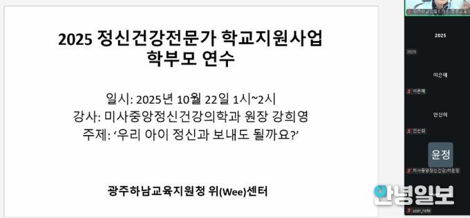 안녕일보 배윤 기자 | 광주하남교육지원청 위(Wee)센터는 10월 22일 관내 초·중·고 학부모 130여 명을 대상으로 ‘우리 아이 정신과 가도 될까요? 정신과에 대한 올바른 이해와 편견 해소’를 주제로 비대면 부모 교육을 진행했다.