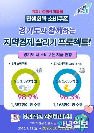 안녕일보 배윤 기자 | 경기도가 민생회복 소비쿠폰 2차 지급 신청이 오는 31일 오후 6시 마감된다며 기한 내 신청을 당부했다. 기한이 지난 미신청 금액은 자동 소멸된다.