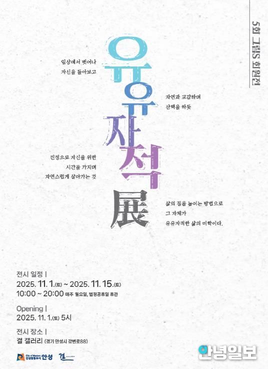 안녕일보 배윤 기자 | 안성천 우리동네 작은미술관 결갤러리에서는 오는 11월 1일부터 15일까지 그림스아뜰리에 제5회 회원전 ‘유유자적’이 열린다. 이번 전시는 바쁜 일상 속에서 잠시 걸음을 멈추고, 자연과 교감하듯 마음을 산책하는 여유의 시간을 주제로 마련됐다.