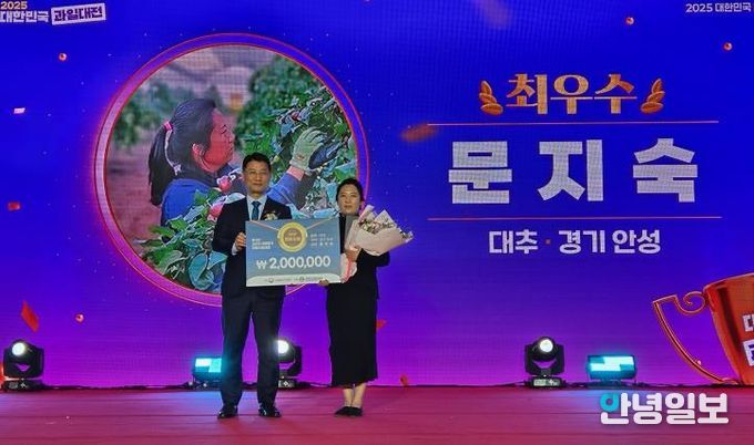 안녕일보 배윤 기자 | 농림축산식품부 주최, 한국과수농협연합회 주관으로 하는 ‘2025 대한민국 과일산업대전 대표과일선발대회’에서 안성시가 2023년부터 대추부문에서 최우수상, 우수상을 수상하여 3년 연속 대추부문 최고자리에 올랐다. 수상자로 문지숙 대표가 최우수상(농림축산식품부장관상)으로 선정됐고, 조재곤 대표가 우수상(산림청장상)으로 선정됐다.
