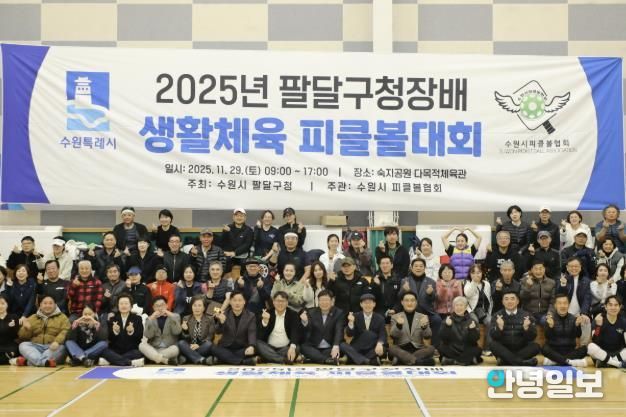 안녕일보 배윤 기자 | 수원시 팔달구는 지난 29일, 숙지공원 다목적체육관에서 2025년 팔달구청장배 생활체육 피클볼대회를 성황리에 개최했다. 이번 대회에는 16개 클럽 160명과 수원시 피클볼협회 임원 관계자를 비롯한 여러 내빈들을 포함한 총 220여명이 참가하여 서로를 격려하고 응원하는 시간을 가졌다.